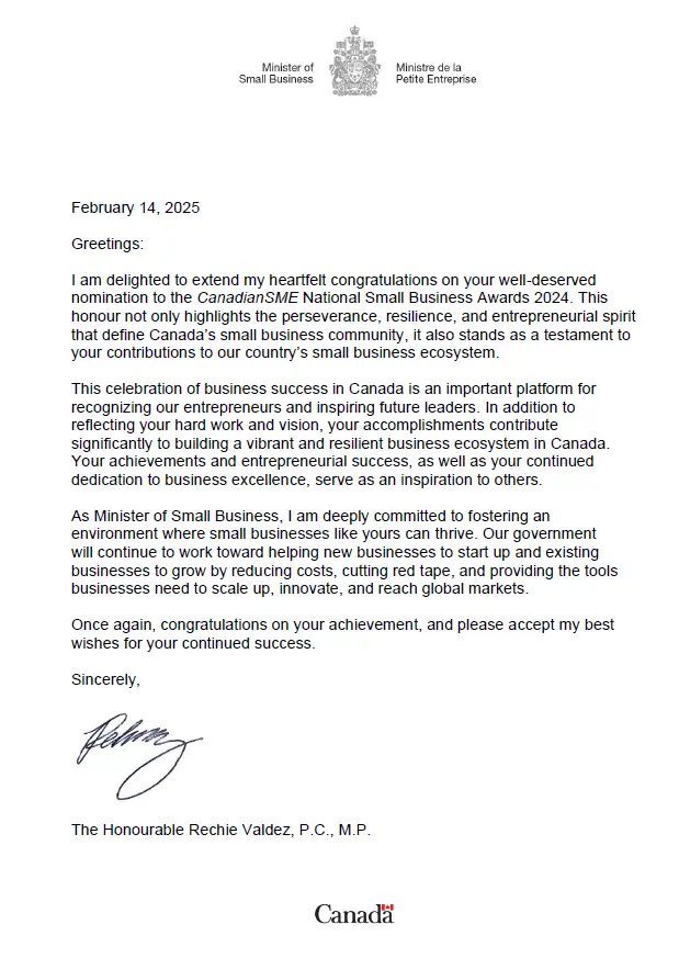 Honored with the nomination to the CanadianSME National Small Business Awards 2024